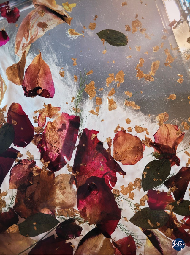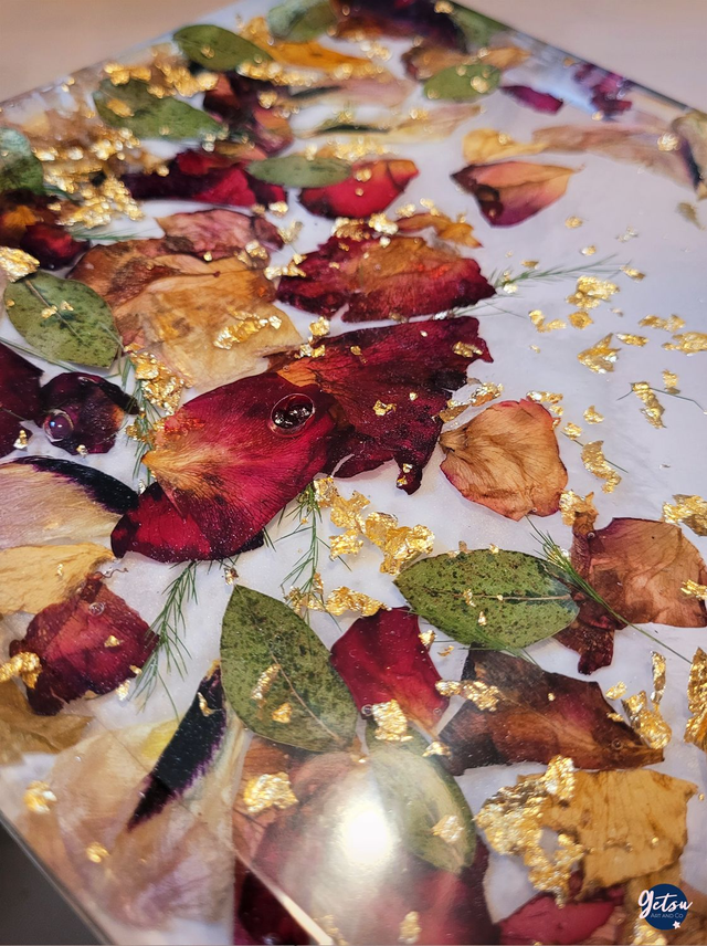 Un petit plateau avec des inclusions de fleurs et feuilles séchées. Parfait pour une décoration chic et proche de la nature !