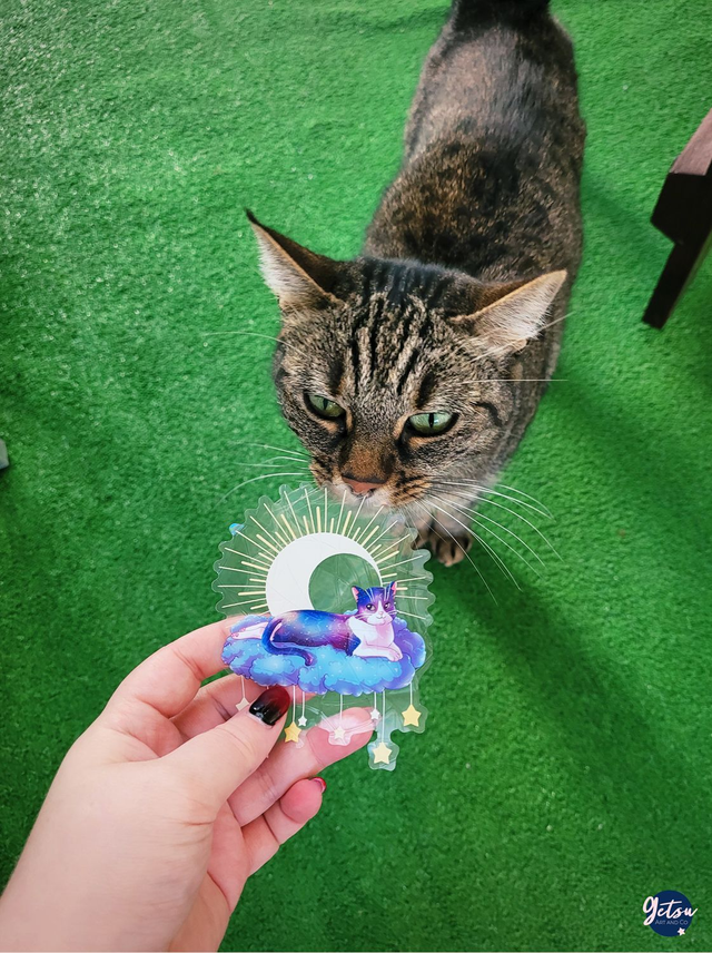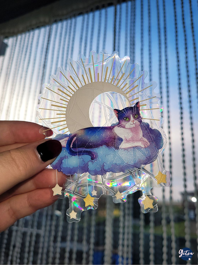 Un joli suncatcher réutilisable avec un petit chat. Ses contours sont holographiques, et laissent passer la lumière pour de jolis arc-en-ciel et faire des jeux de lumière.