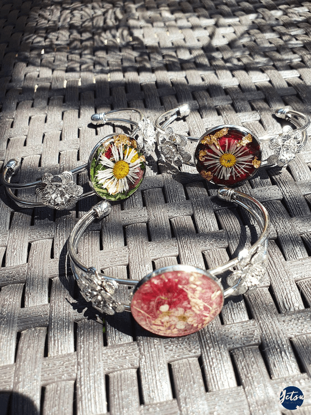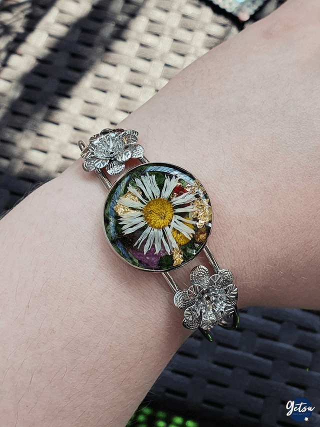 Une manchette originale, où chaque morceau de fleurs et de verdure a été déposé à la main, un à un. Le tout a été scellé dans la résine UV. Il s'agit d'une pièce qui ne sera jamais refaite.