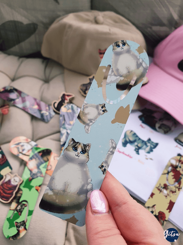 Un marque-page en métal avec le chat du mois de décembre dessus, le ragdoll.