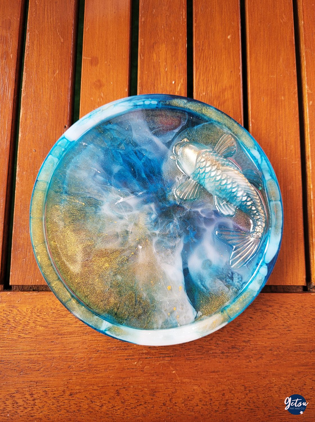 Vide-poche/porte-savon bleu et doré avec carpe bleue